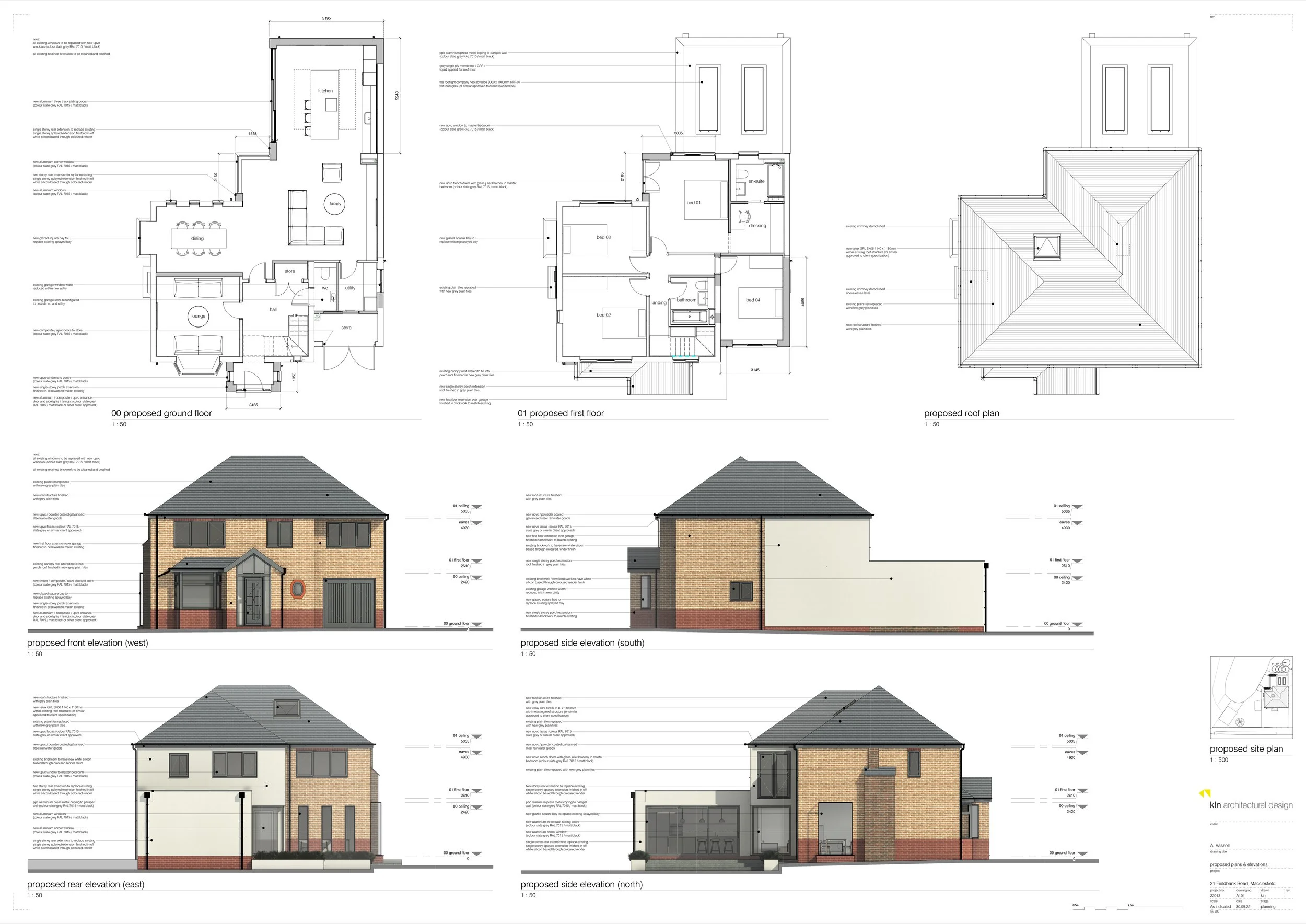 The client brief sought to extend and reconfigure the dwelling to create a generous open-plan lounge, kitchen, and dining space to the rear. At first floor level, the proposals include a master bedroom with ensuite and dressing area, along with a fourth double bedroom. The plot benefits from a substantial pond to the side and rear curtilage, and the design aims to maximise views and visual connection to this feature.