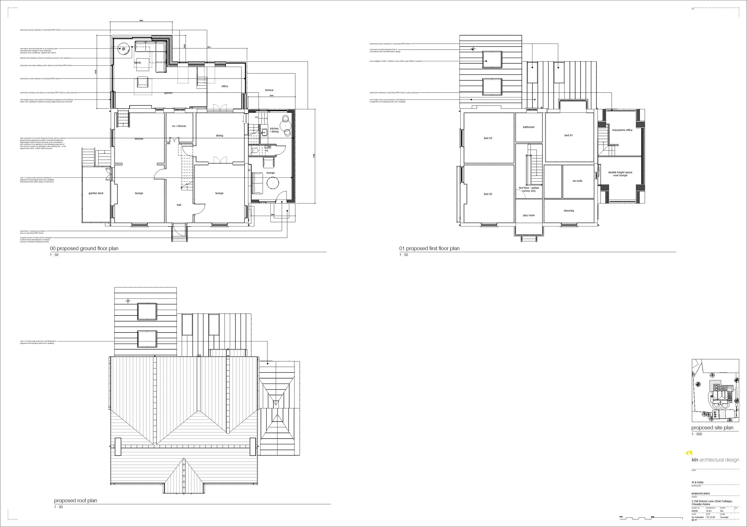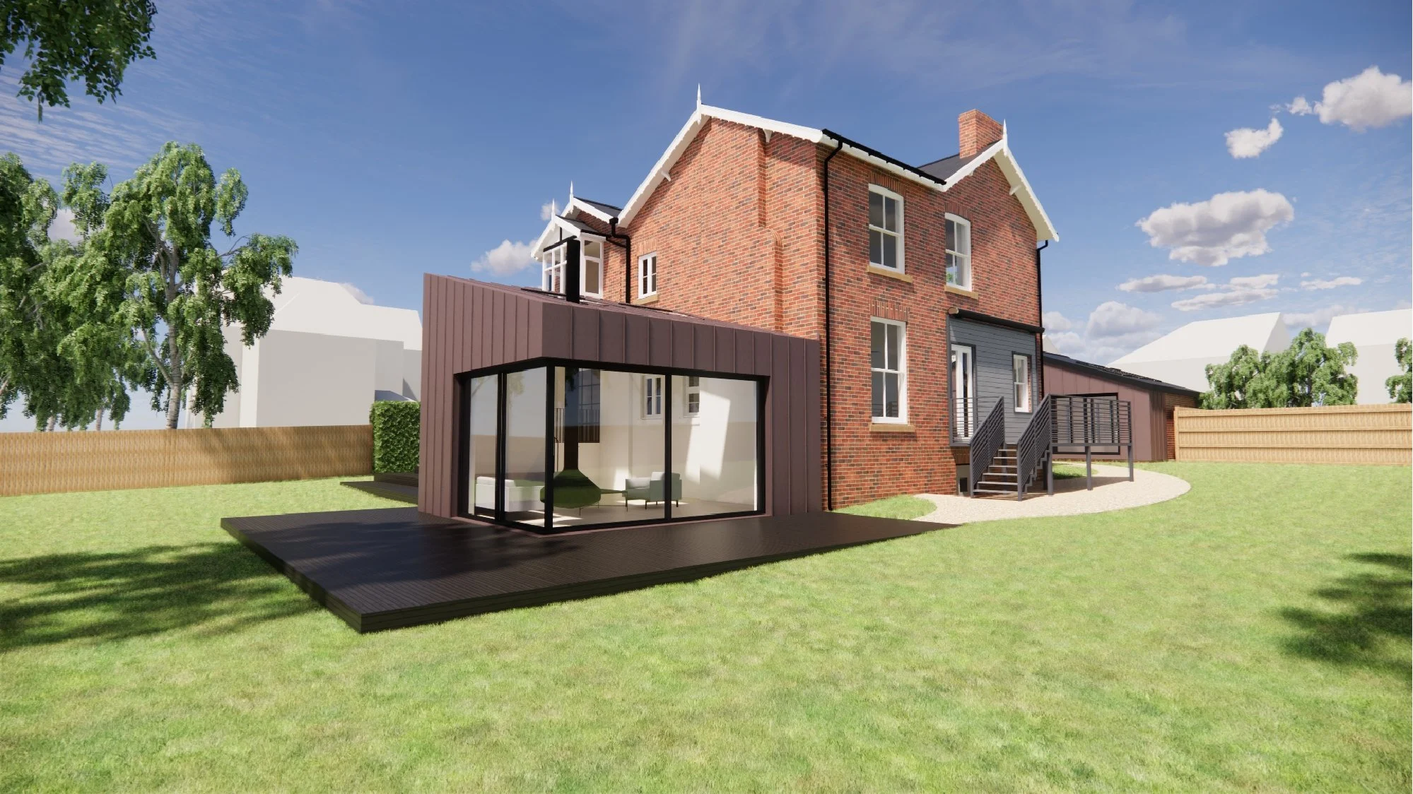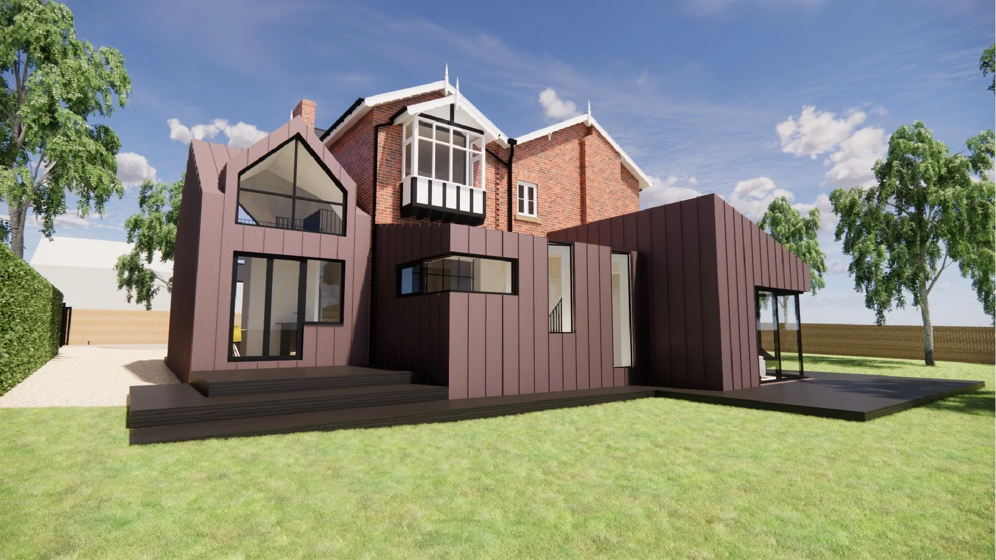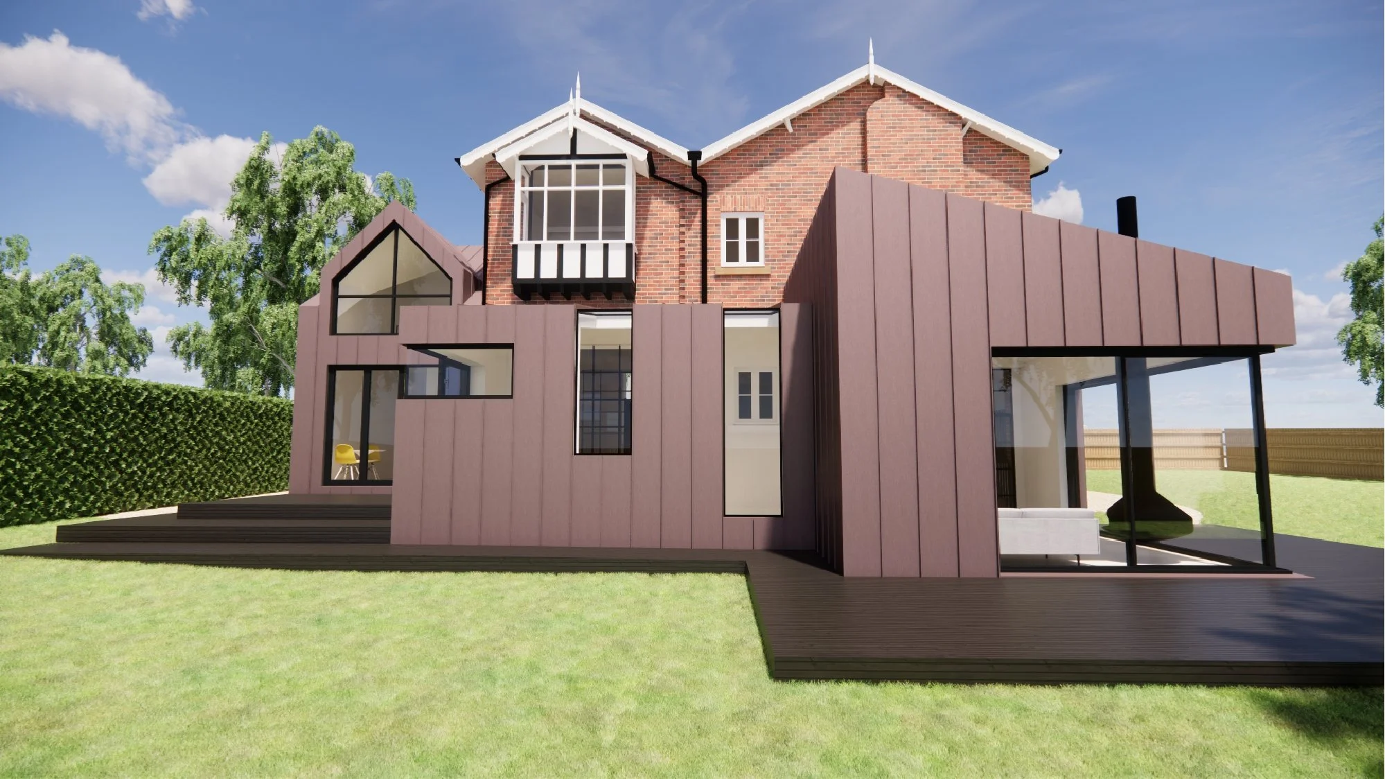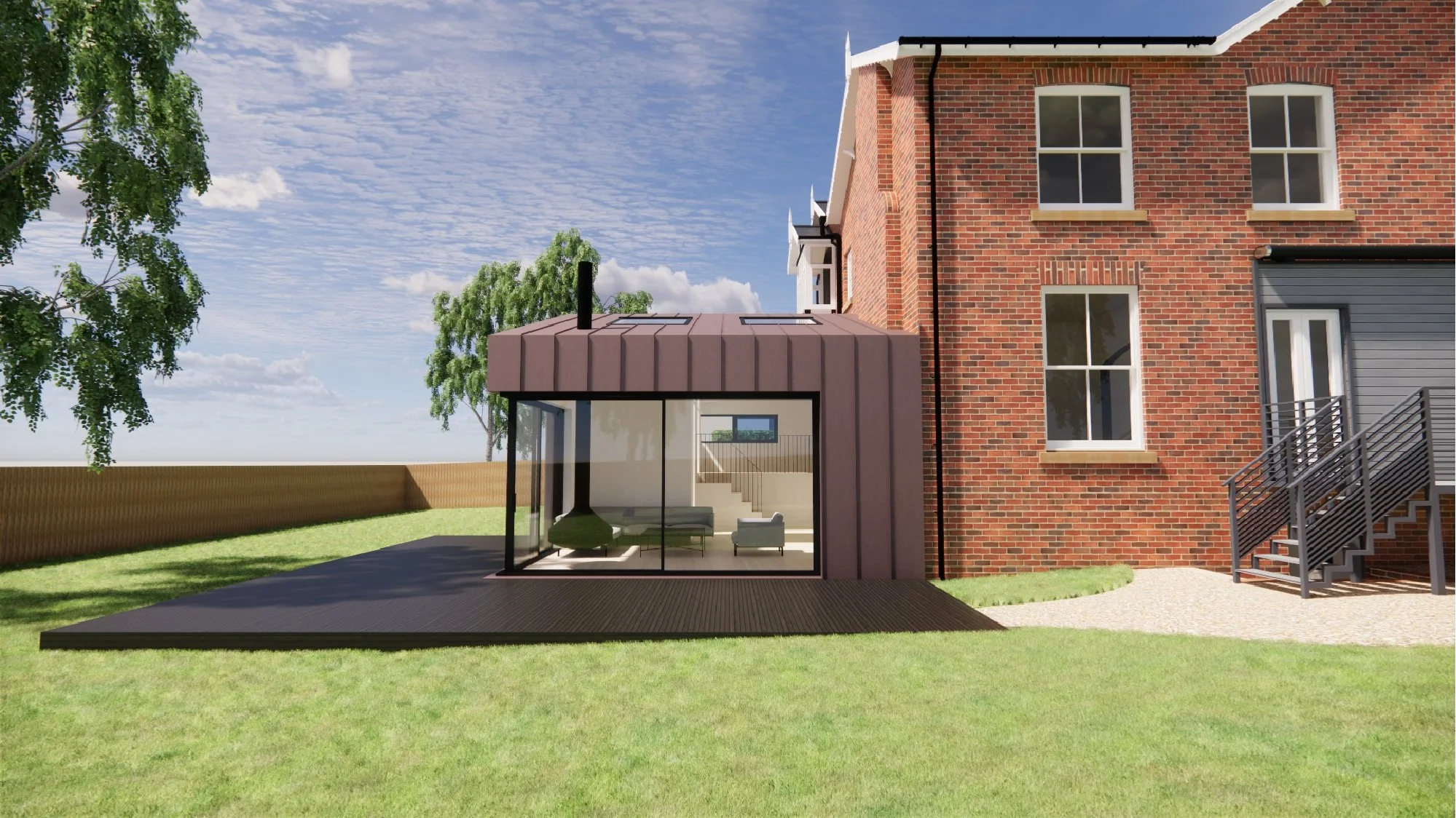 The proposed external finish of pre-weathered, or pre-patinated, red standing seam zinc has been selected to complement the existing brickwork, while clearly distinguishing the new extensions from the original house.