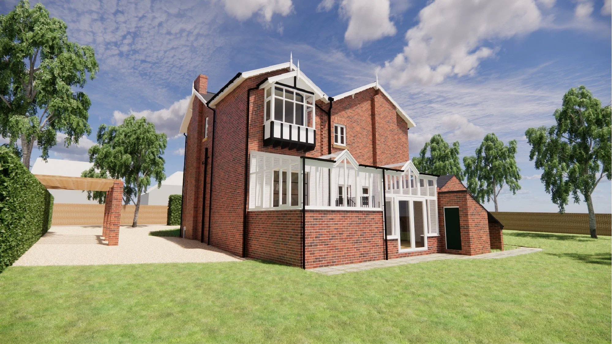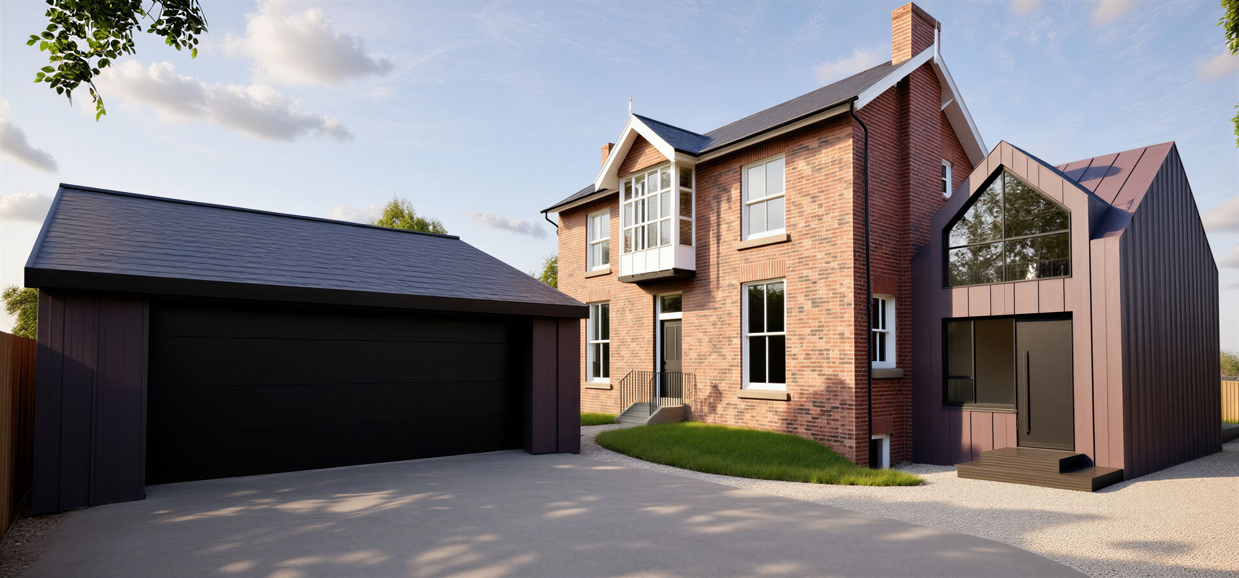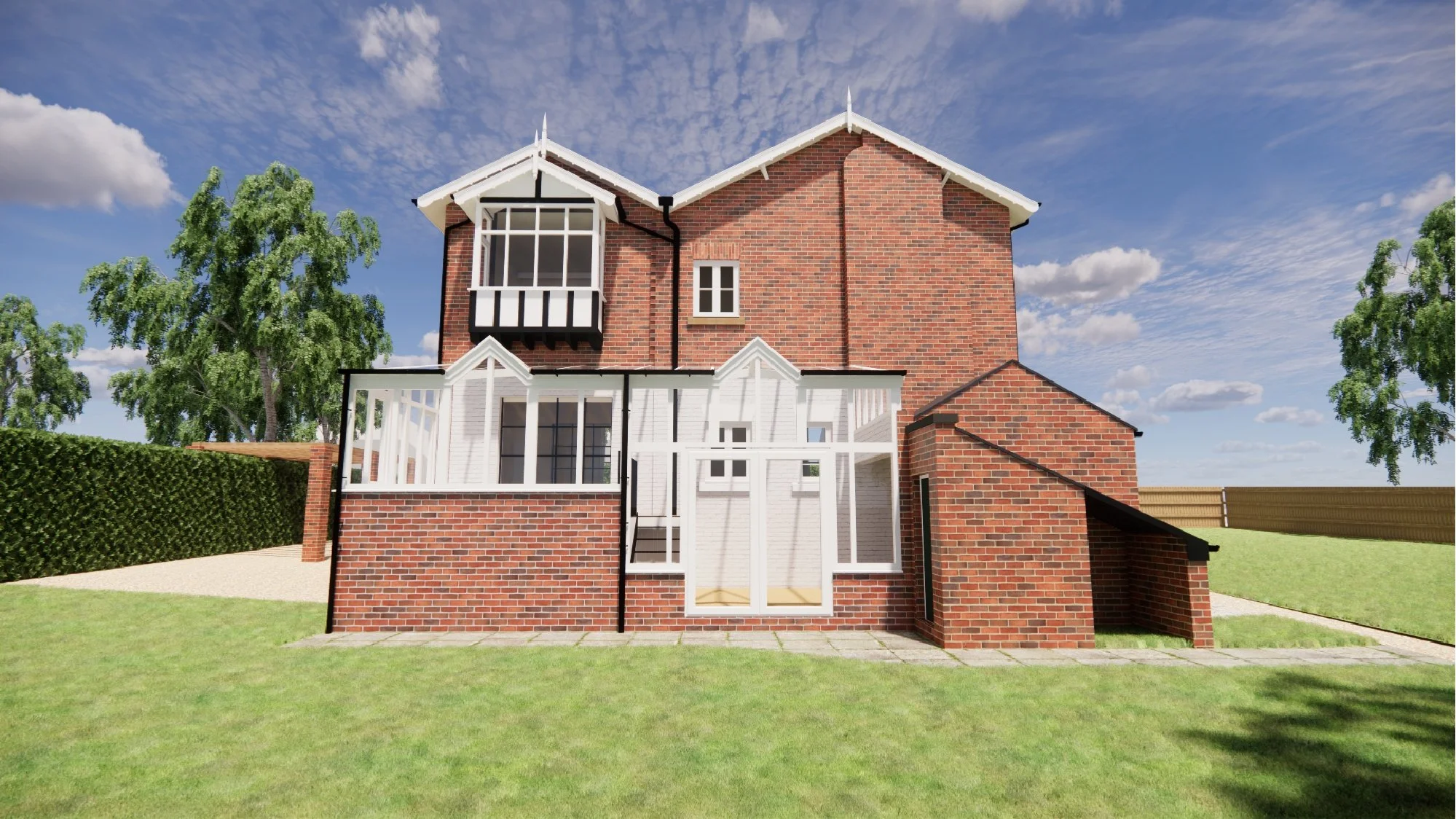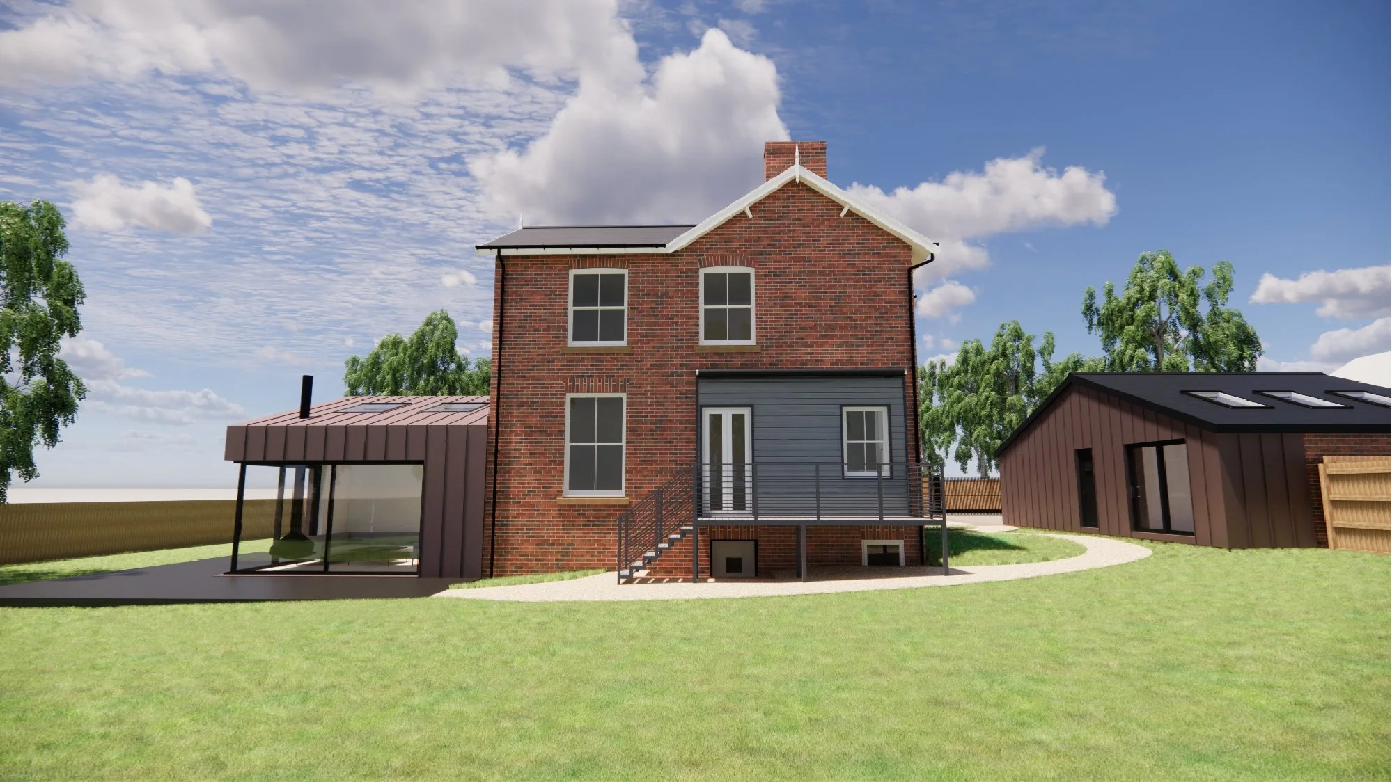 The client brief was to design a side annex extension to accommodate visiting family and friends, renovate or replace the existing rear glazed extension, and design a detached double garage with an integrated gym.