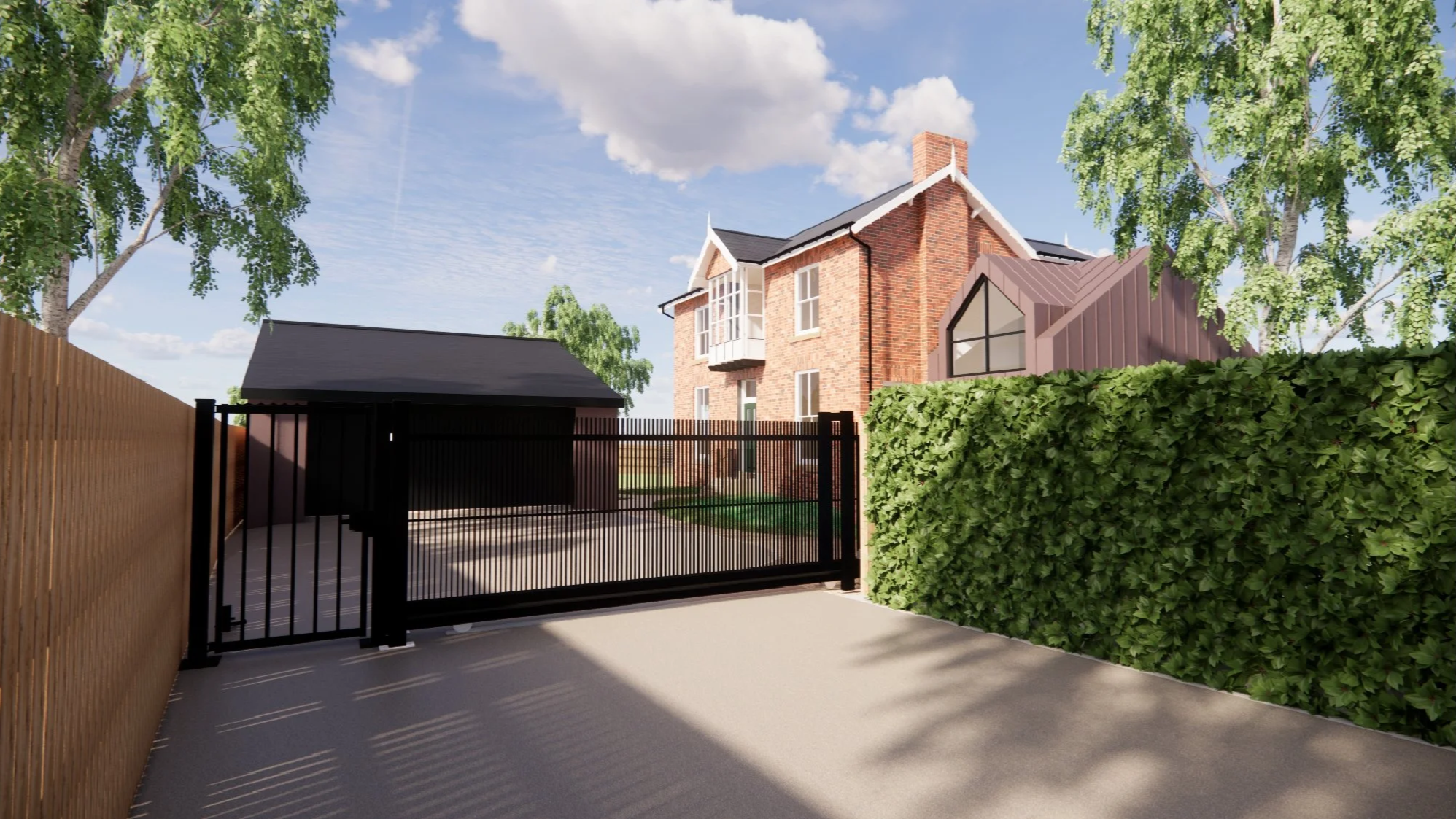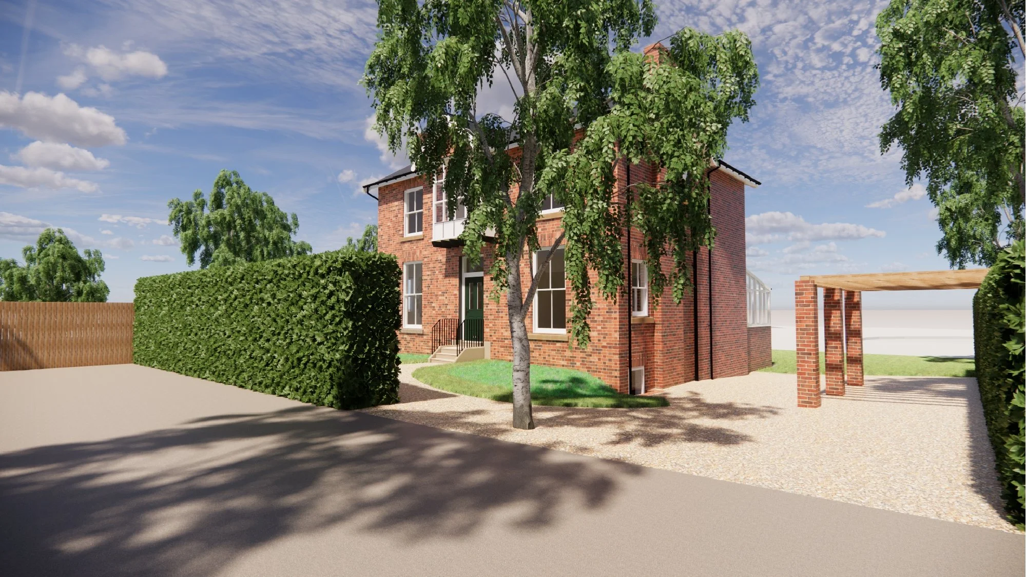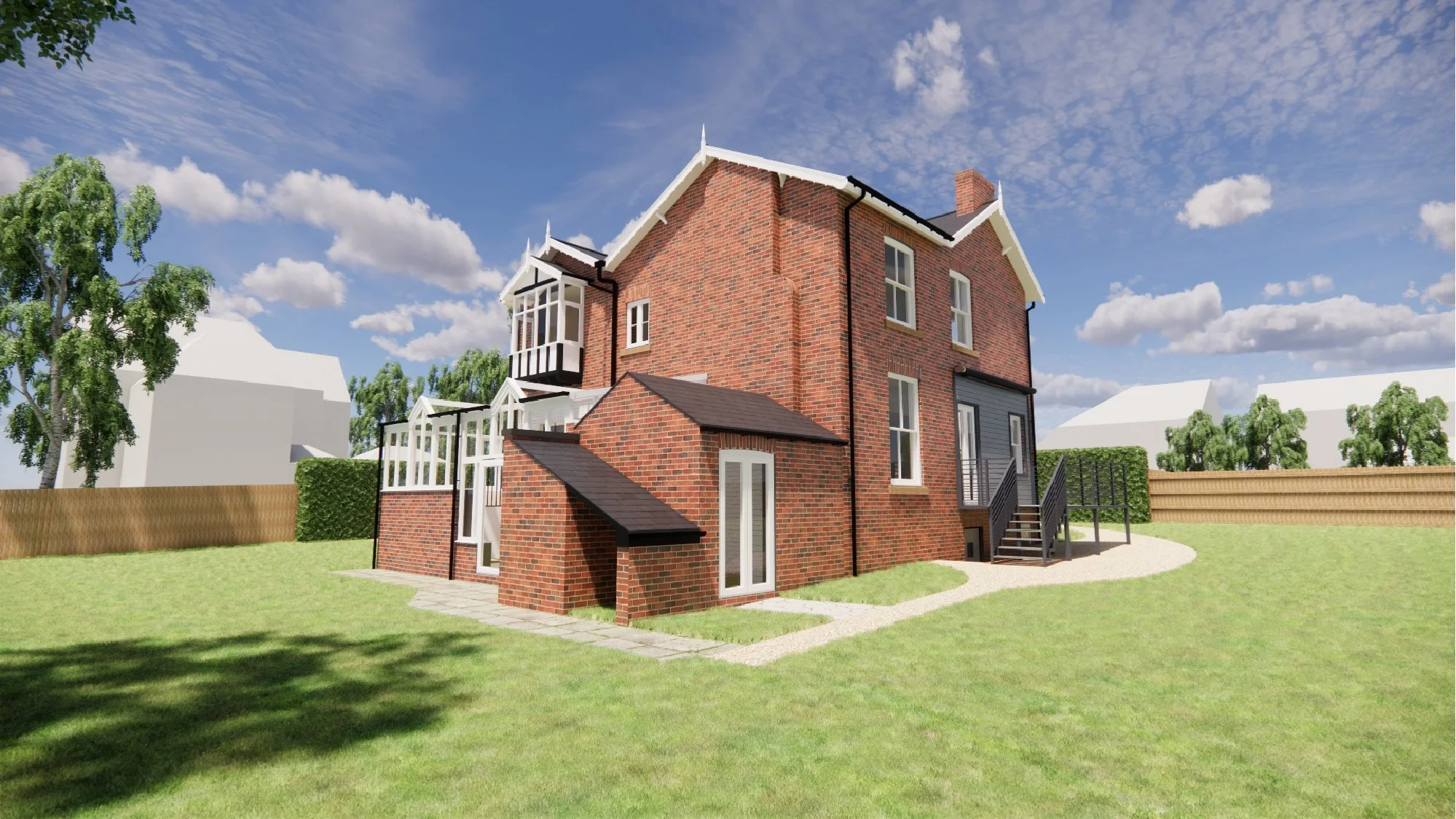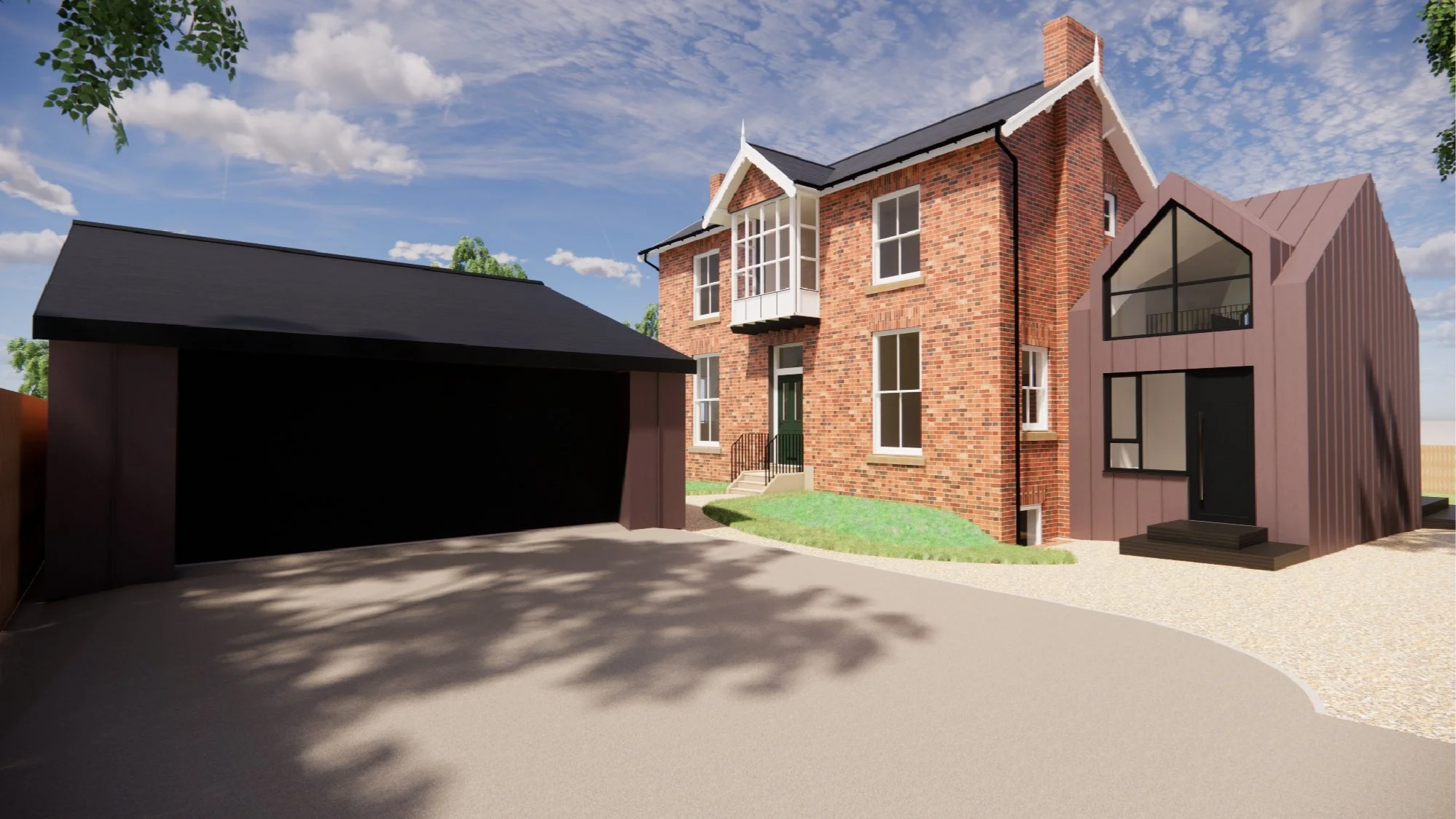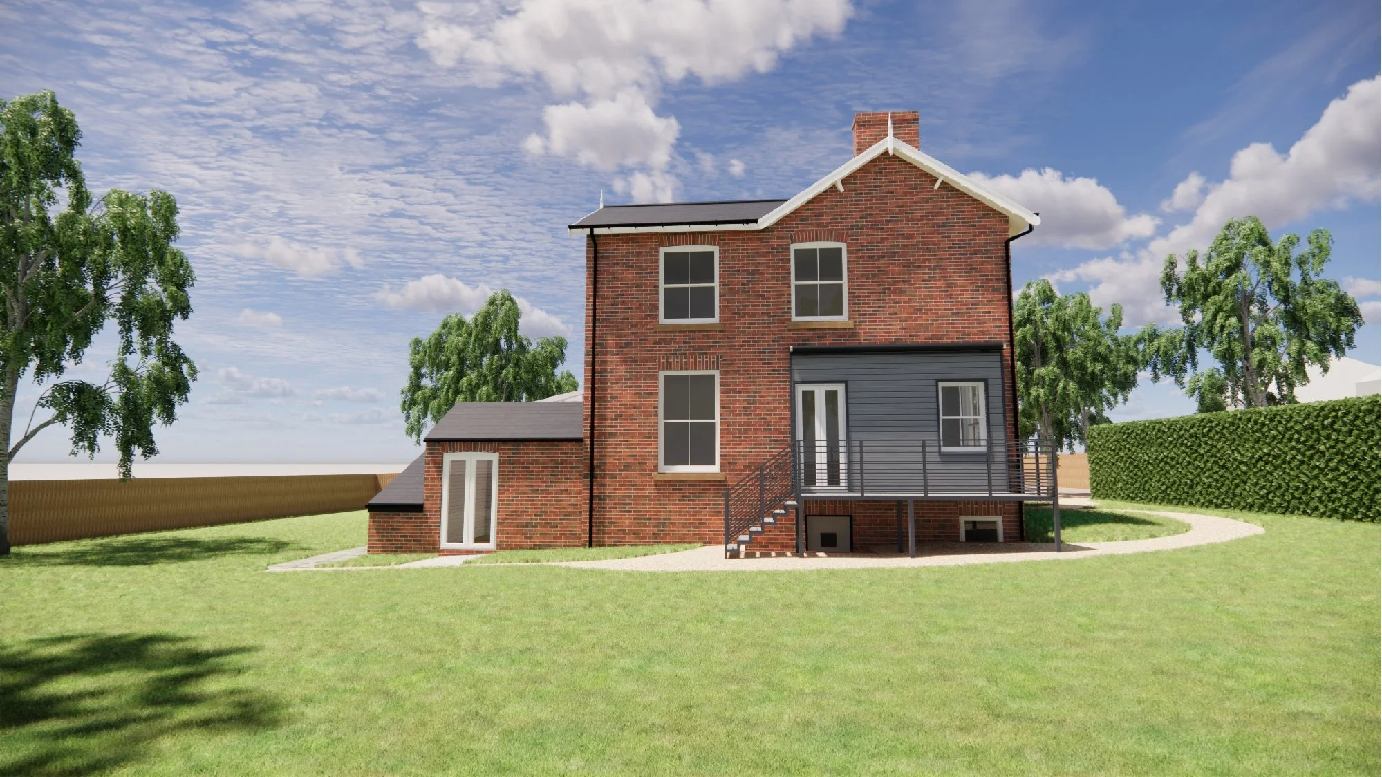 The client brief was to design a side annex extension to accommodate visiting family and friends, renovate or replace the existing rear glazed extension, and design a detached double garage with an integrated gym.