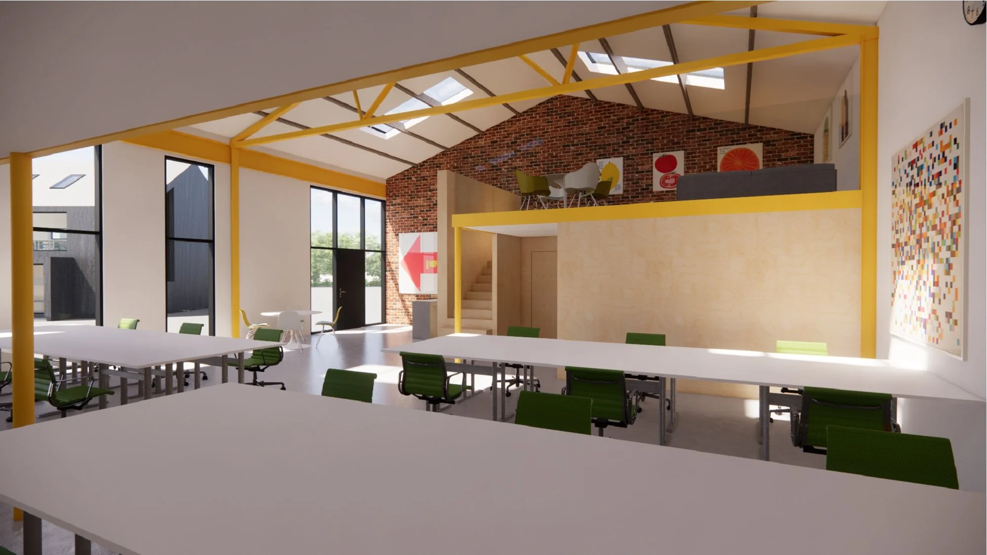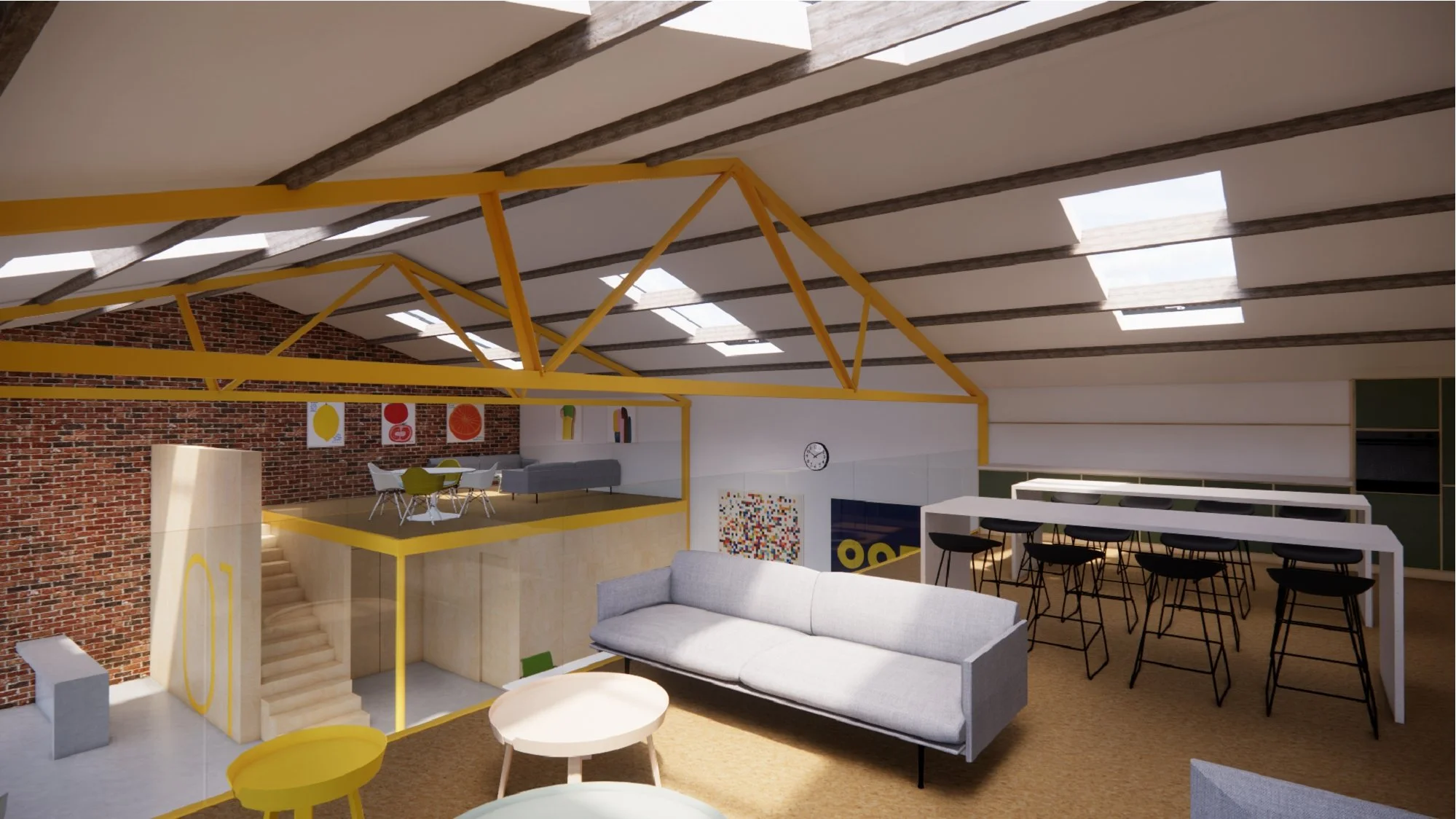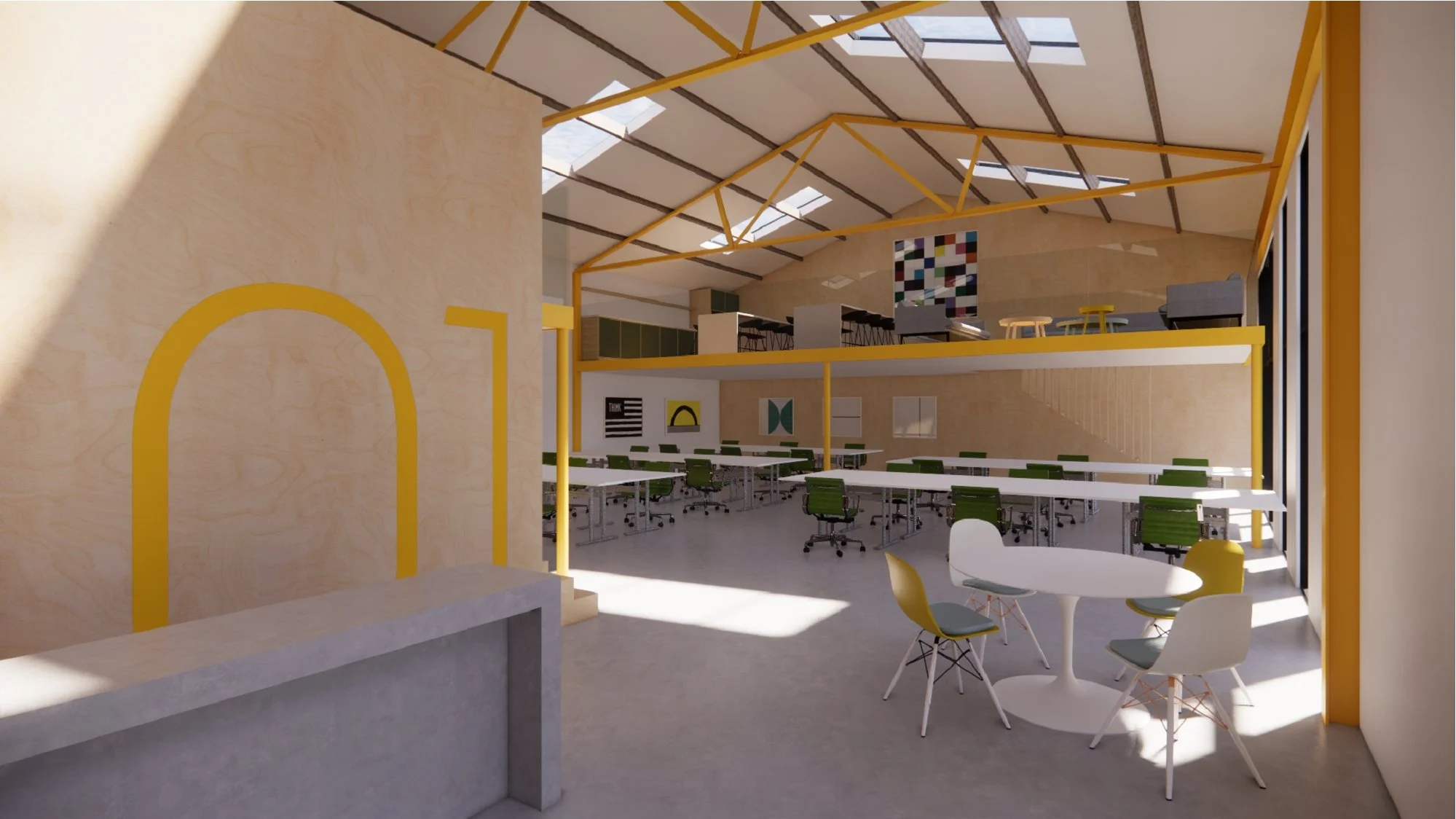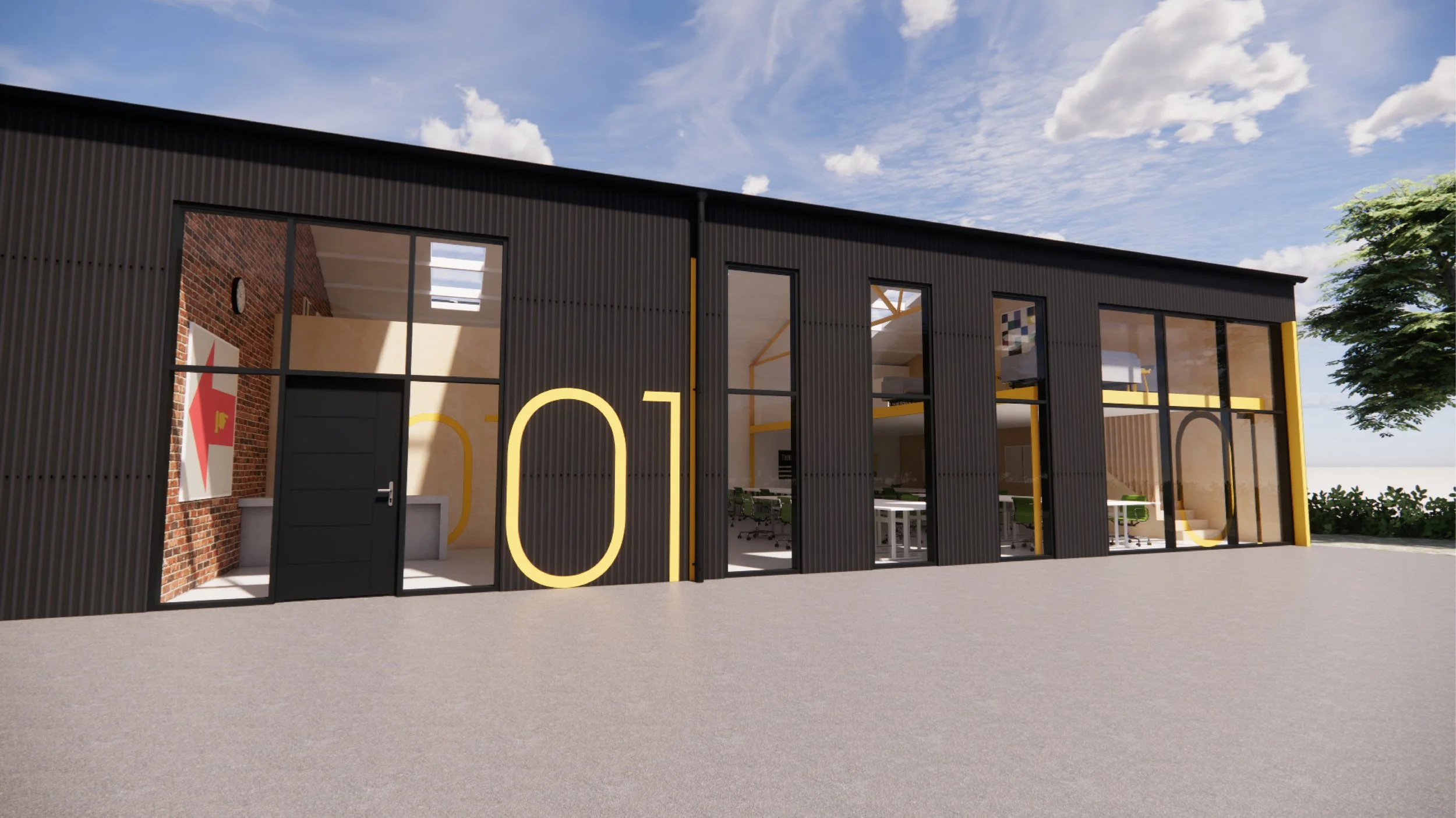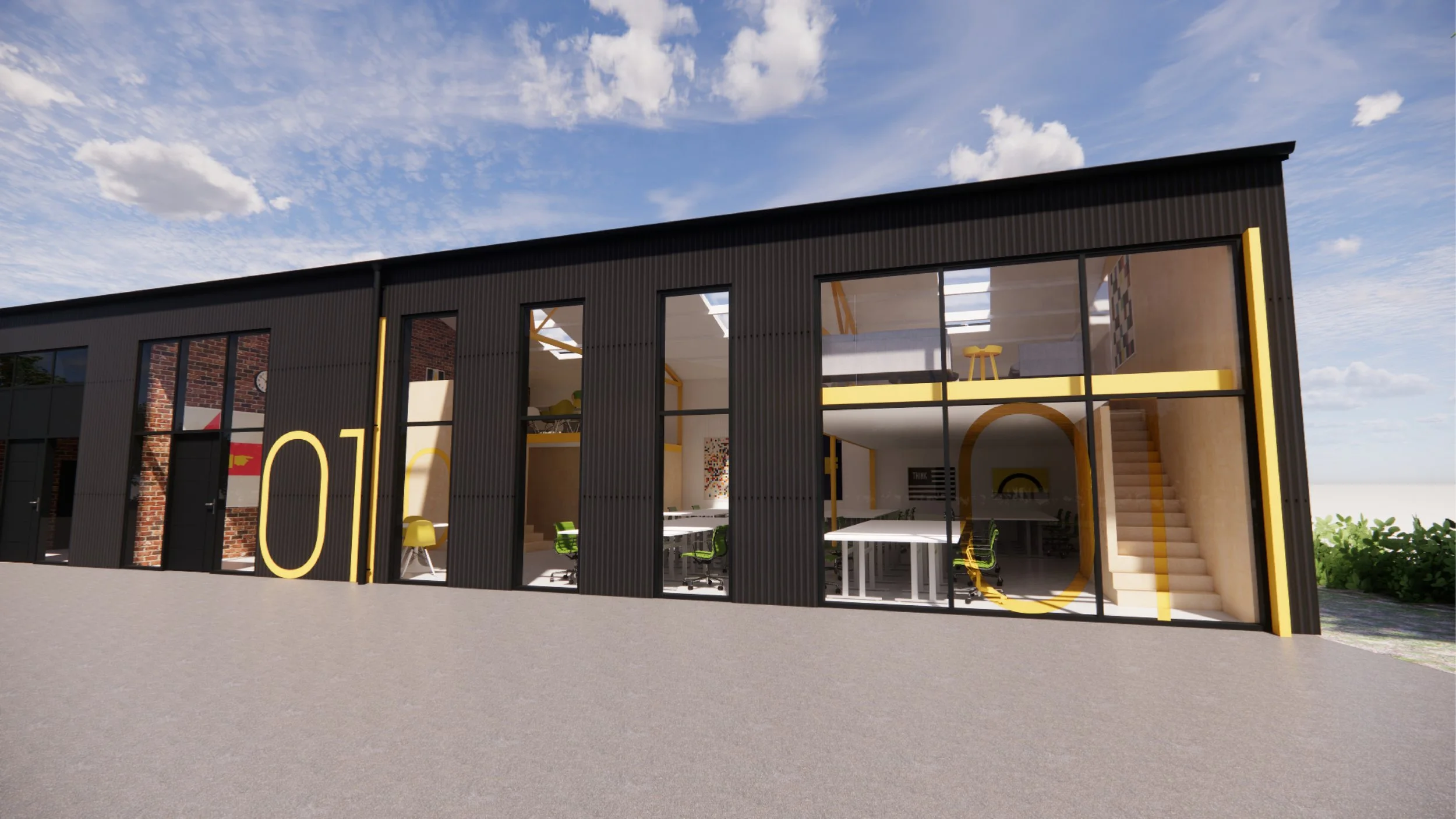 The proposed shared workspace and industrial building renovation responds to the brief by replacing the existing corrugated cladding with new matt black corrugated metal cladding, providing a visual reference to the office building. A new shared office space and mezzanine level are introduced, with retained brickwork and the existing steel structure expressed internally and finished in intumescent yellow paint.