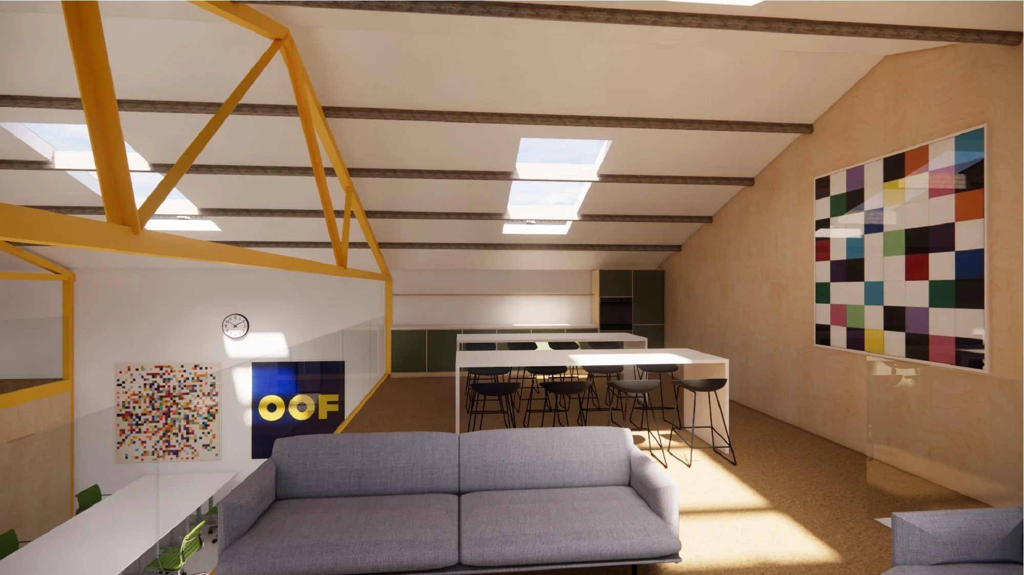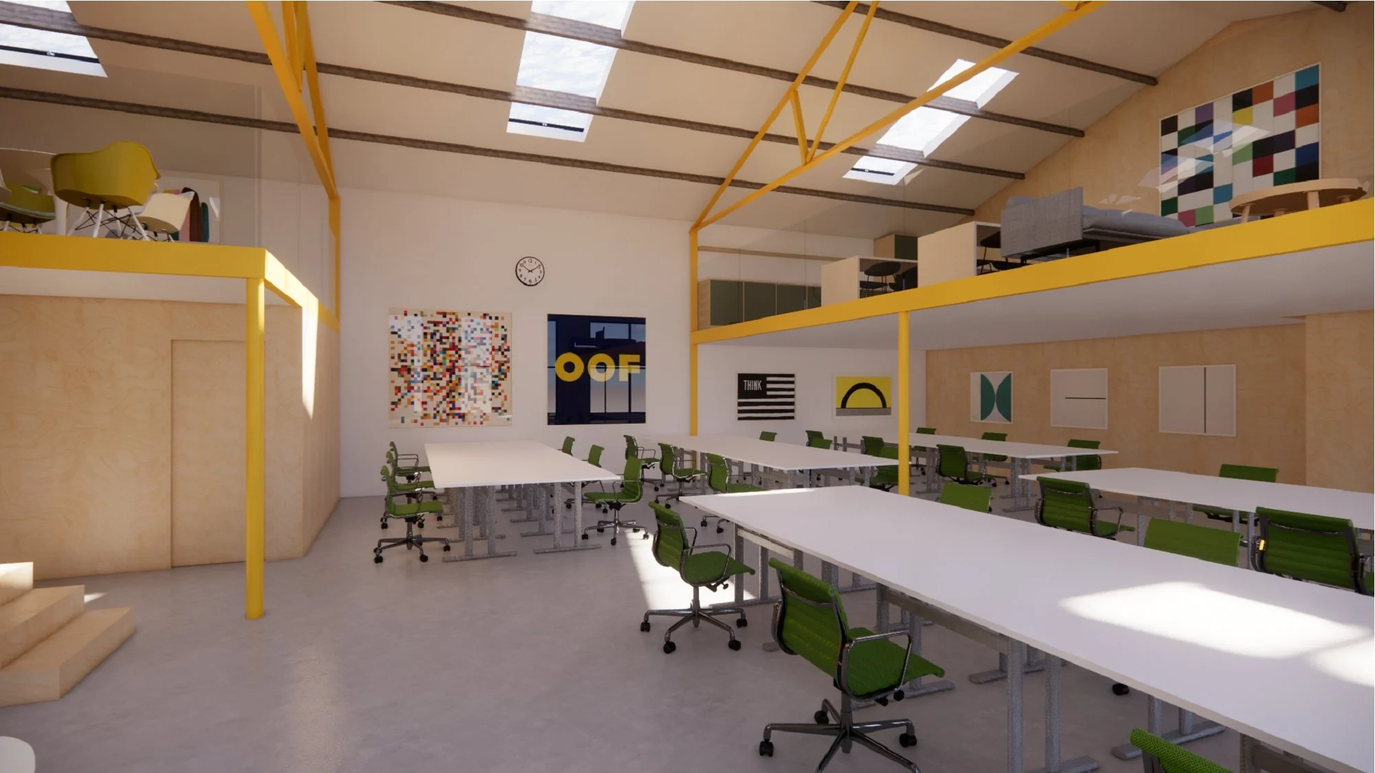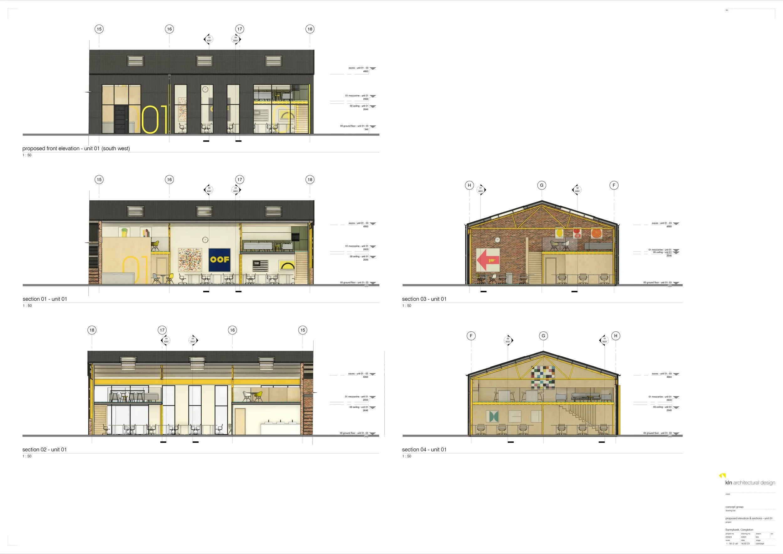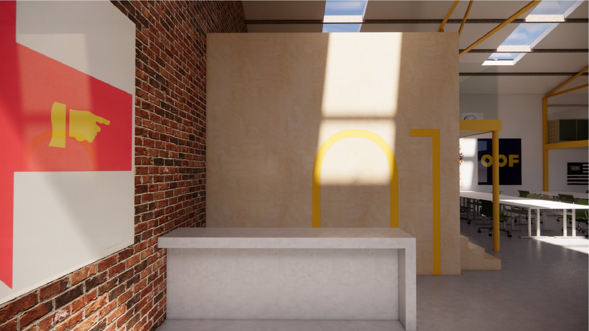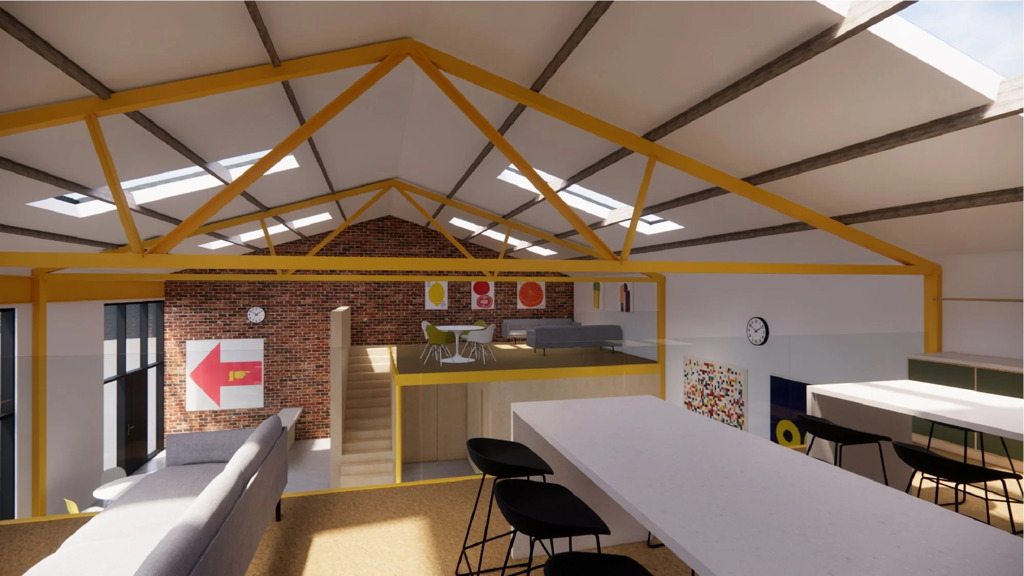 The proposed shared workspace and industrial building renovation responds to the brief by replacing the existing corrugated cladding with new matt black corrugated metal cladding, providing a visual reference to the office building. A new shared office space and mezzanine level are introduced, with retained brickwork and the existing steel structure expressed internally and finished in intumescent yellow paint.