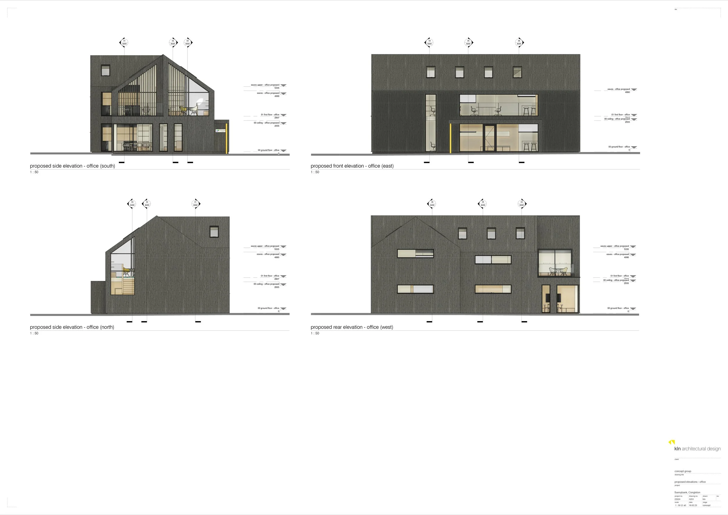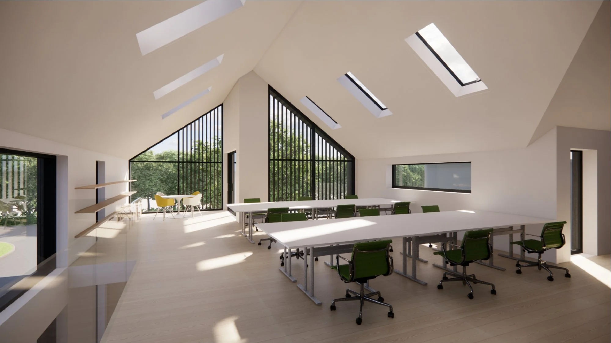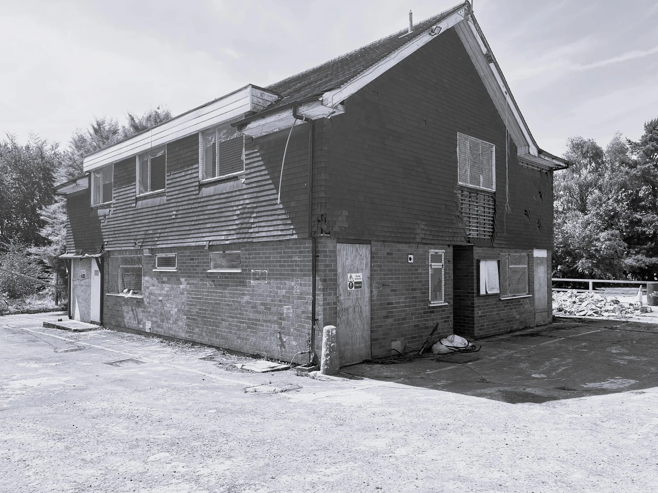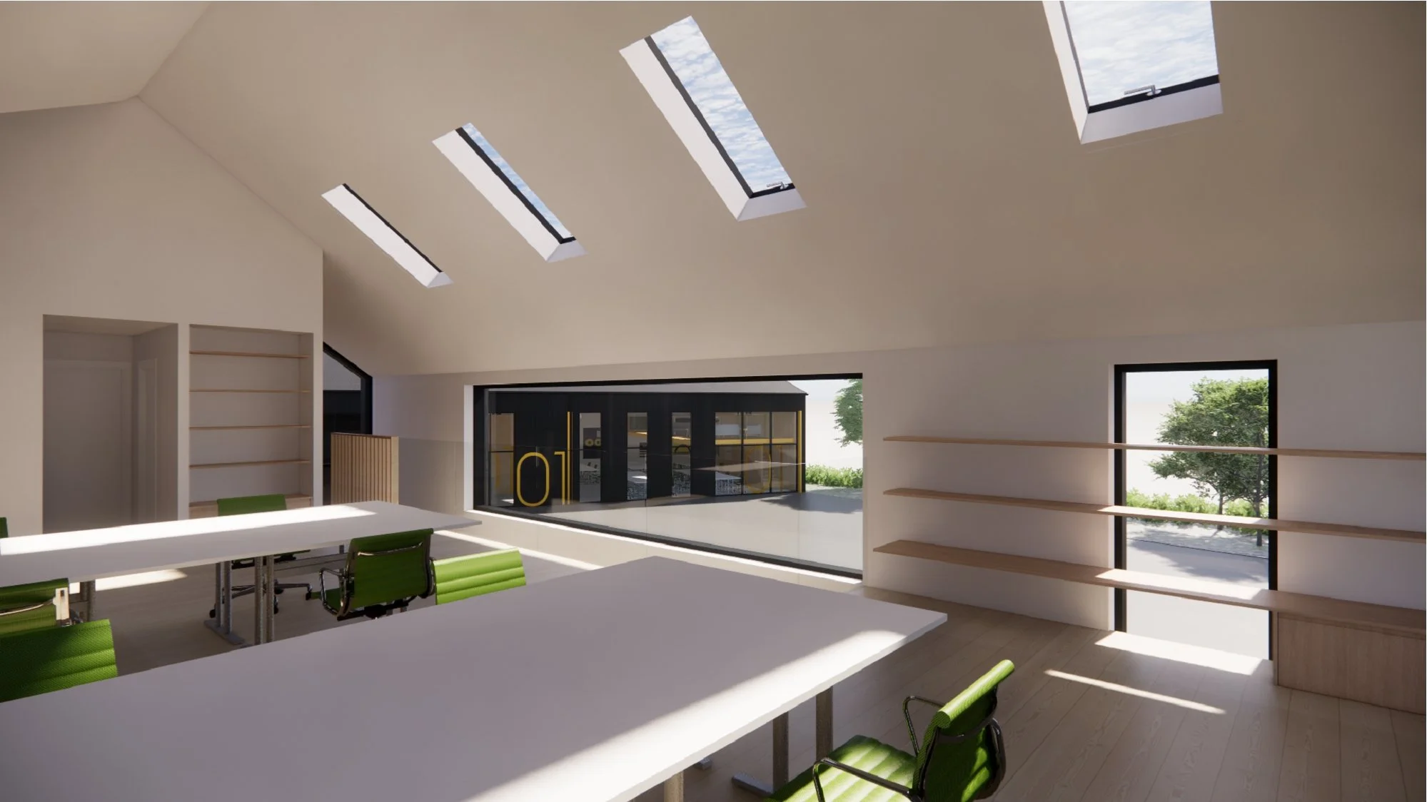 The proposed office design responds to the brief through largely replanning and recladding of the existing building, together with a modest extension, a new apex roof, and extensive areas of glazing. The design largely retains the existing building footprint due to it’s location within greenbelt and is conceived as either a renovation or rebuild, subject to structural assessment and cost considerations.