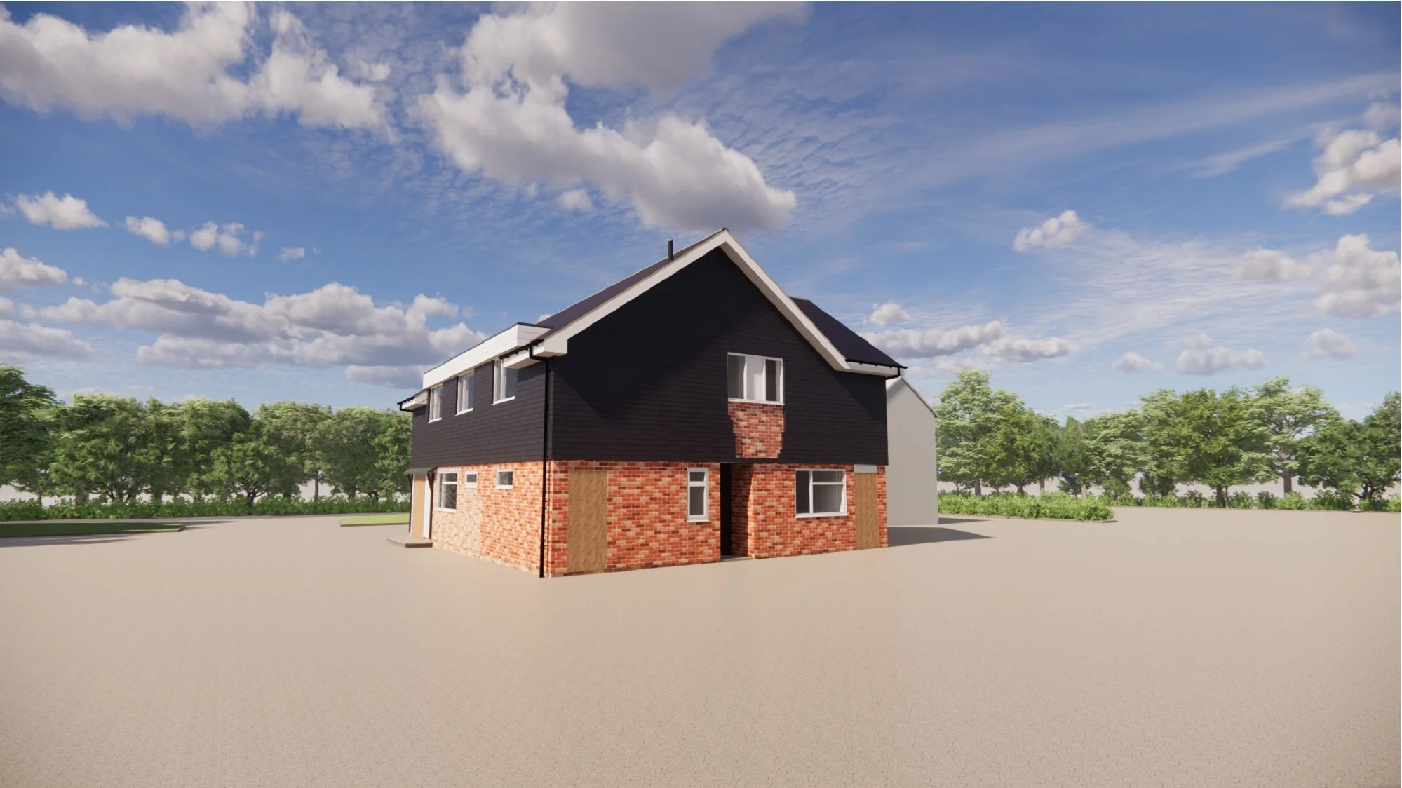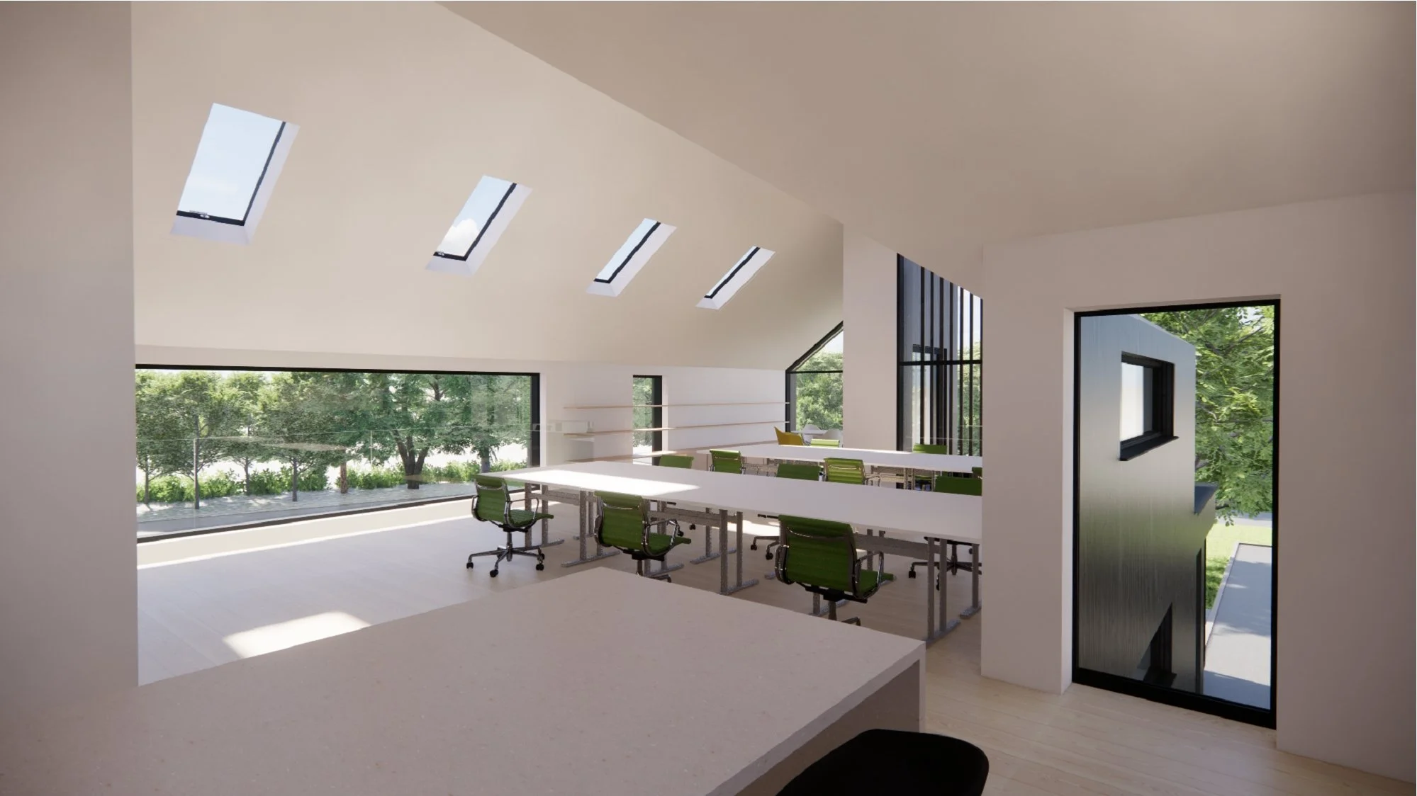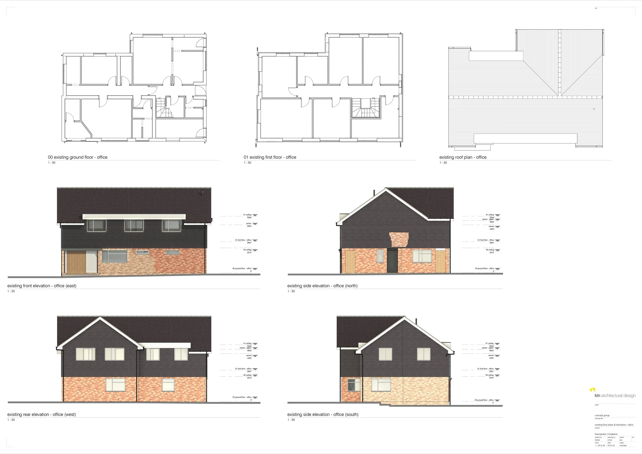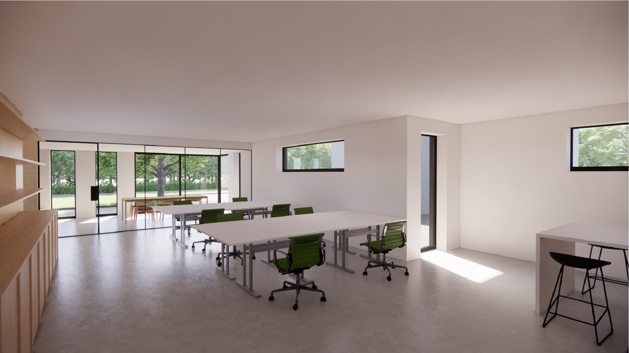 The proposed office design responds to the brief through largely replanning and recladding of the existing building, together with a modest extension, a new apex roof, and extensive areas of glazing. The design largely retains the existing building footprint due to it’s location within greenbelt and is conceived as either a renovation or rebuild, subject to structural assessment and cost considerations.