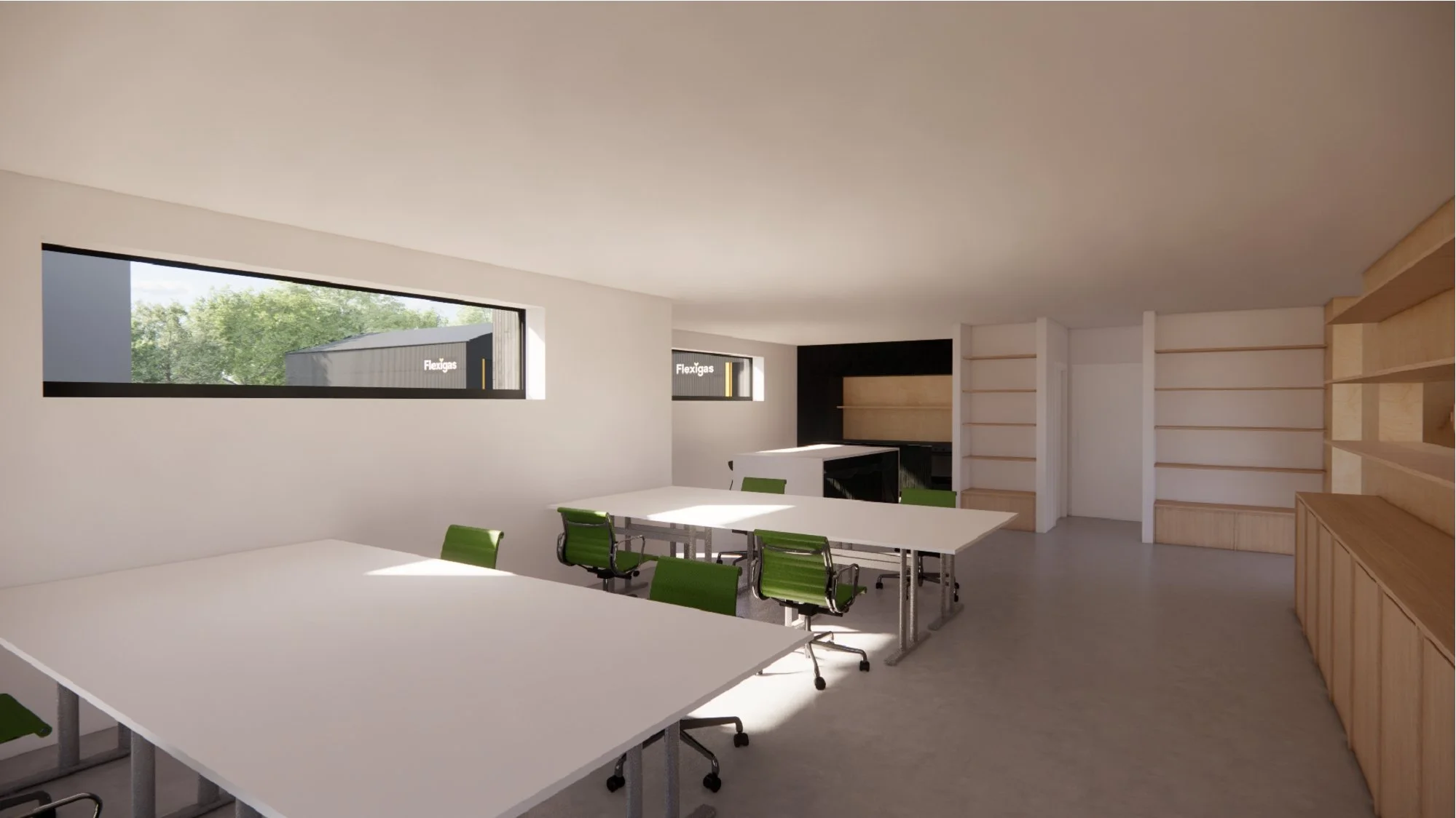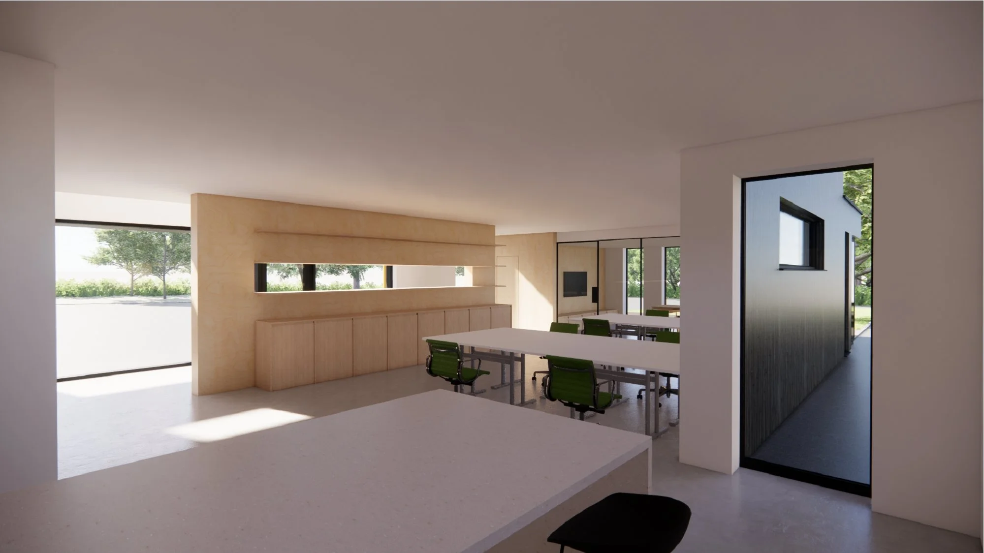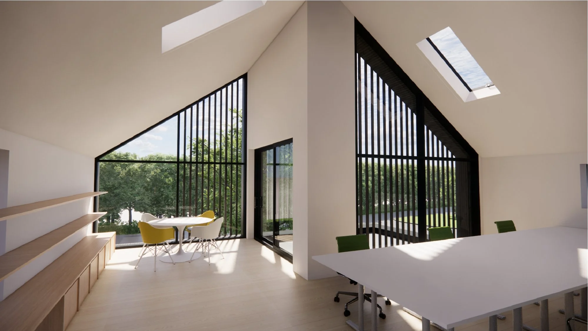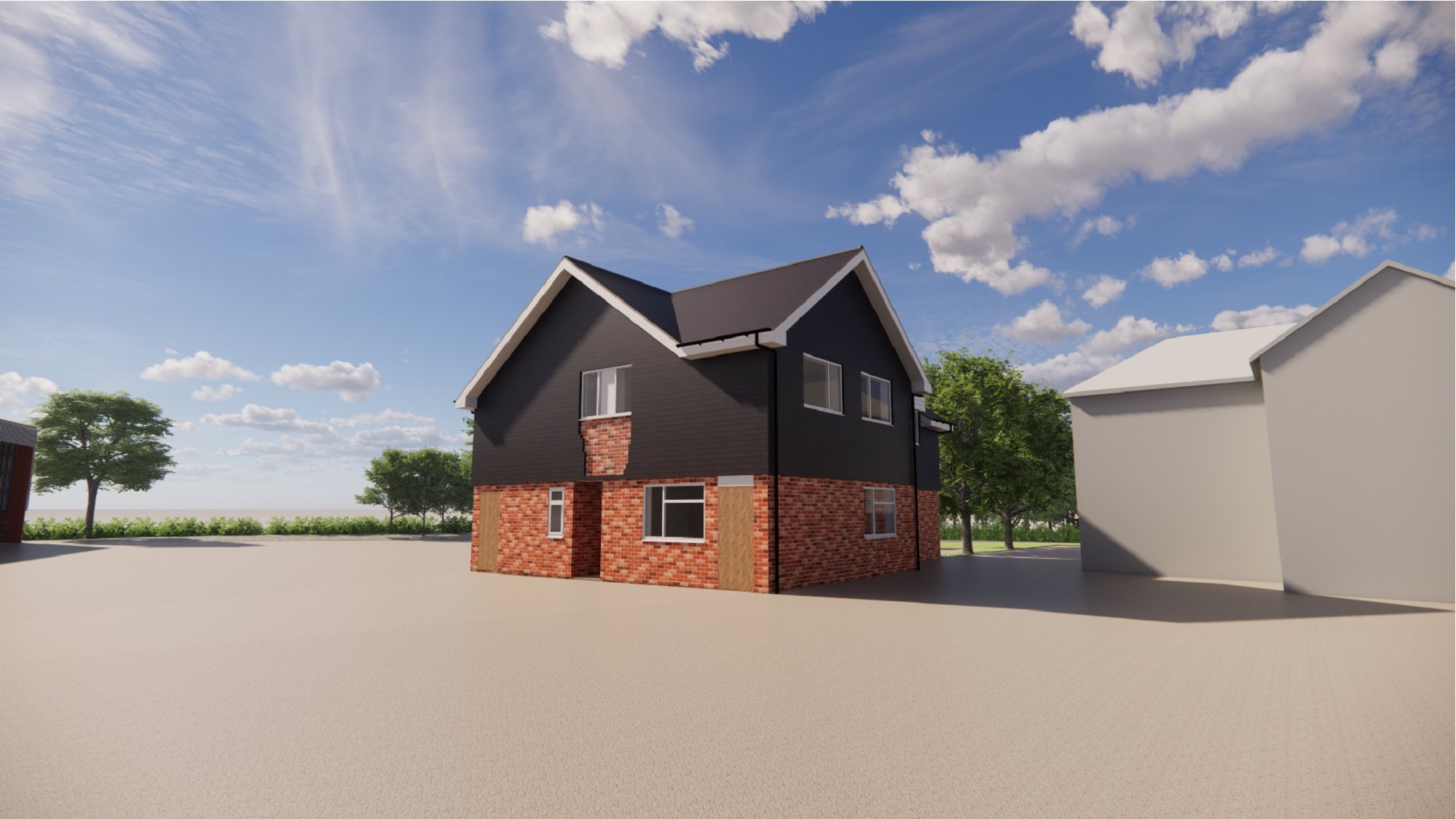 The proposed office design responds to the brief through largely replanning and recladding of the existing building, together with a modest extension, a new apex roof, and extensive areas of glazing. The design largely retains the existing building footprint due to it’s location within greenbelt and is conceived as either a renovation or rebuild, subject to structural assessment and cost considerations.